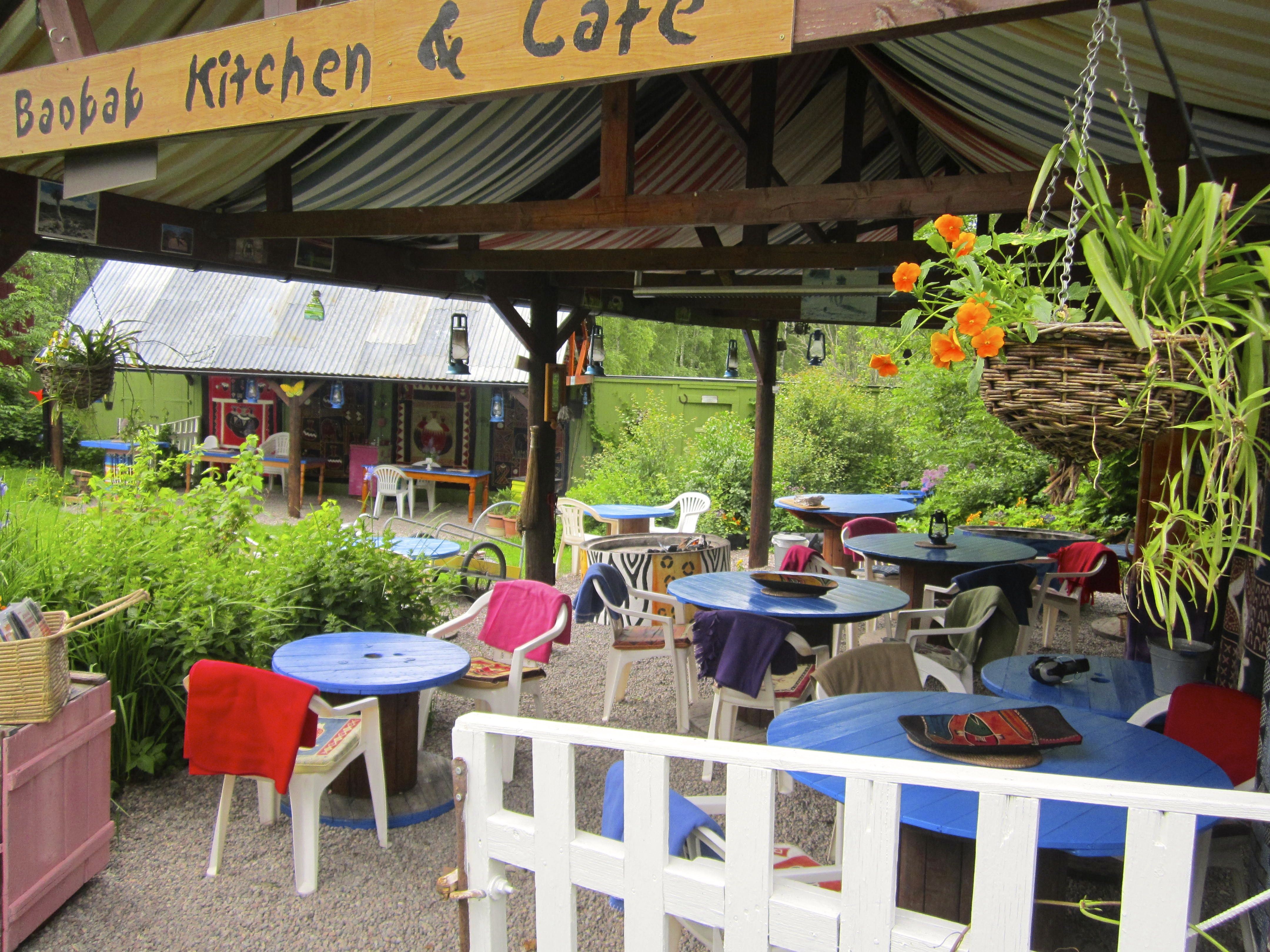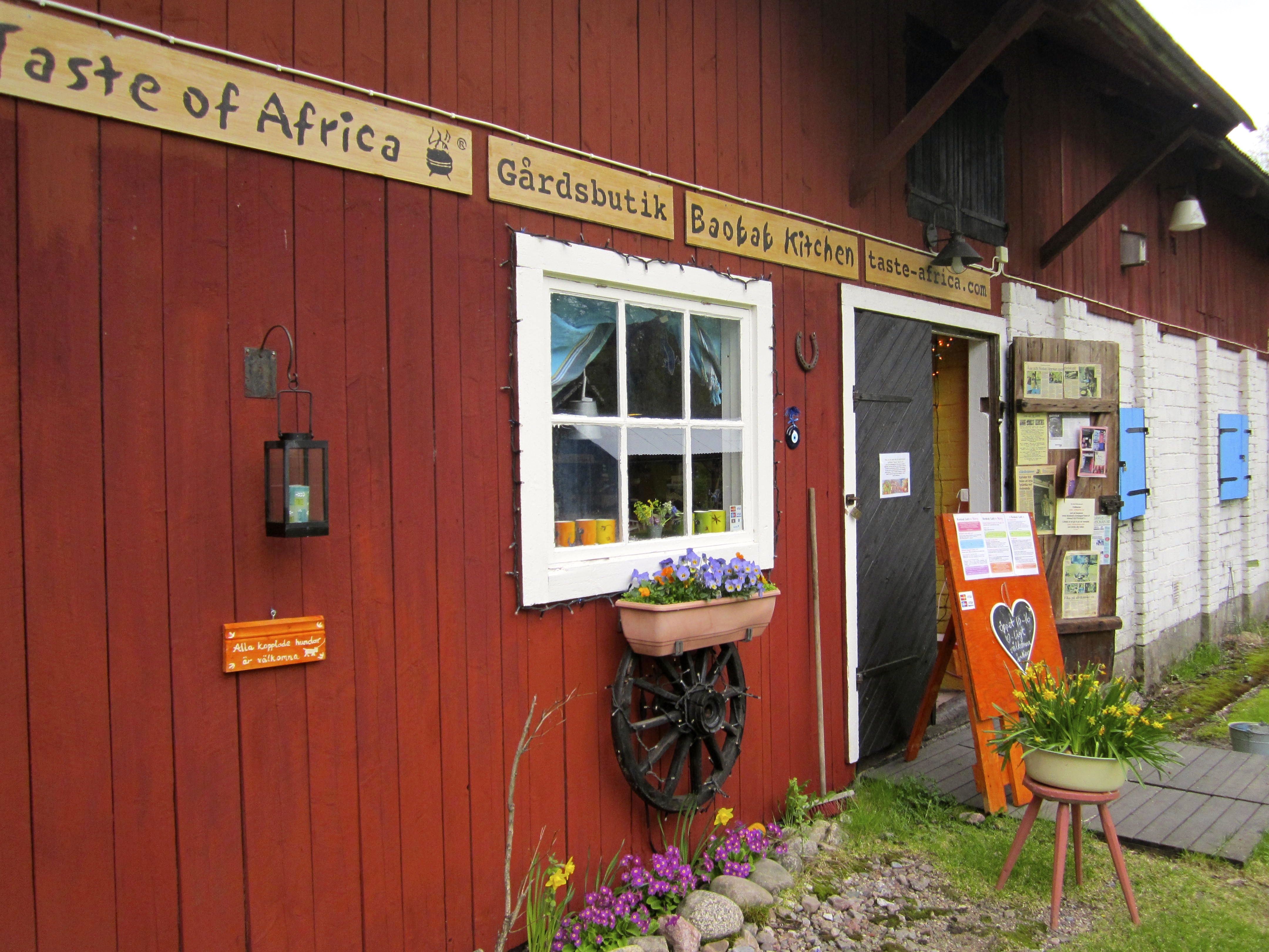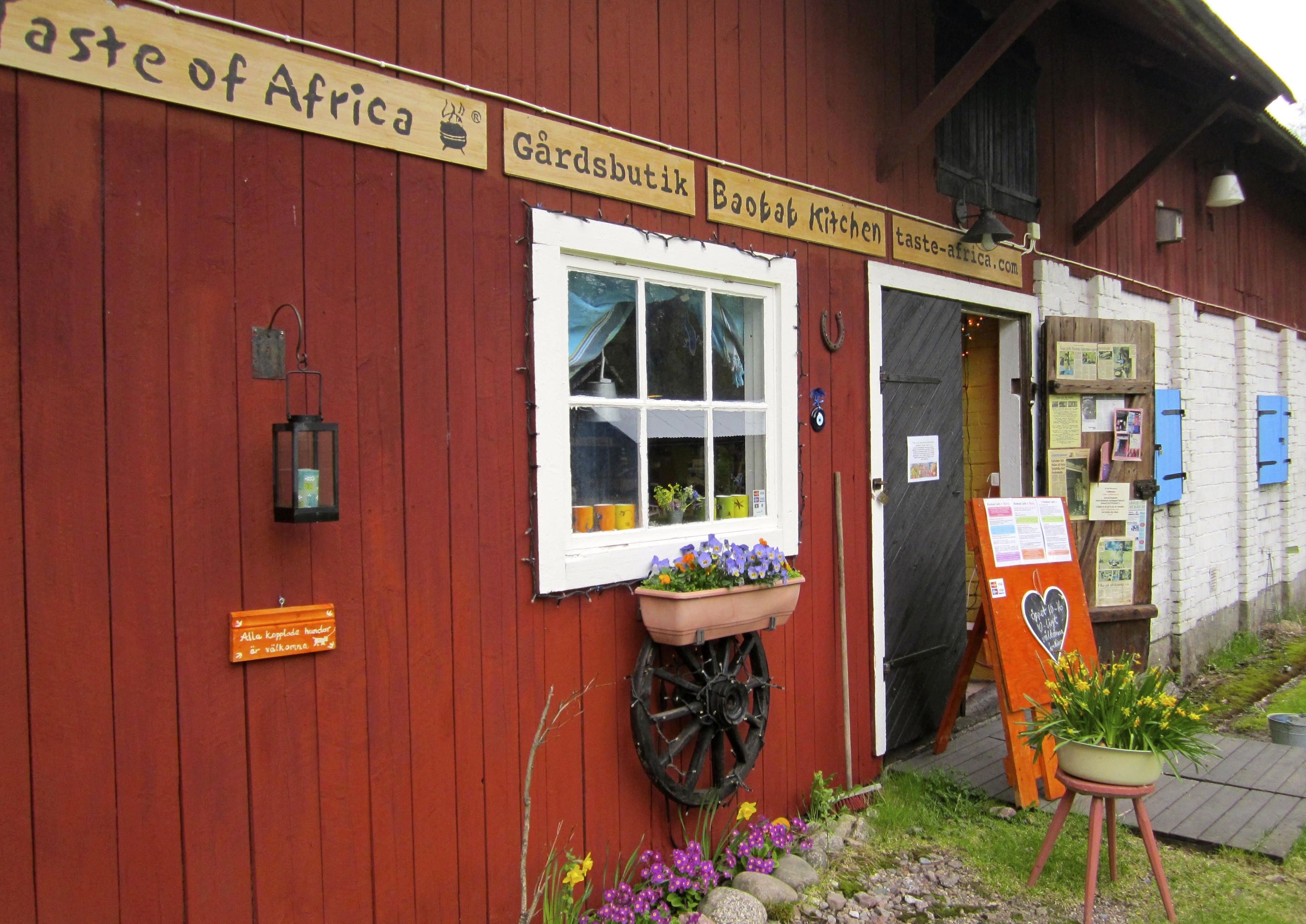 I Gårdsbutiken hittar du genuint afrikanskt hantverk, textilier, keramik, korgar, järngrytor & mycket mer. Provsmaka våra såser & kryddor och få inspiration till nya matidéer! Låt dig förtrollas av något.. gärna med en historia! I Baobab Café fikar du i skön utomhusmiljö under tak. Vår specialité är afrikanska kakor & bröd, bakade med smör, ekoägg & kärlek. Vi gräddar över eld i afrikanska järngrytor. Njut av en kopp ångande afrikanskt kaffe eller bushtea, eller kanske en svalkande exotisk frukjuice, serverad på bricka...always with a smile.