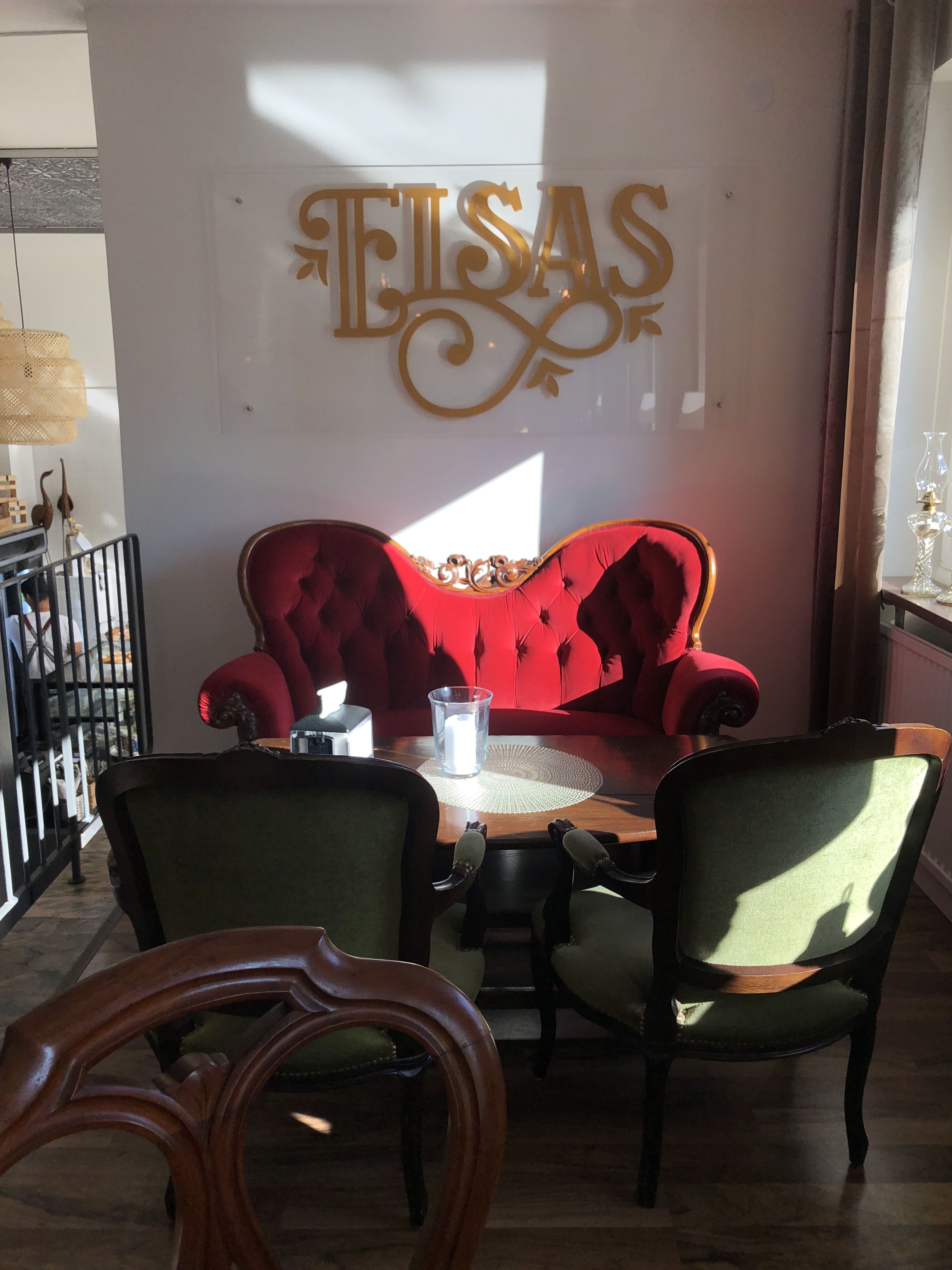Den nya ytan bryts av med snygga äldre möbler och ger caféet fin karaktär. På Elsas serveras allt från mjukglass, bakverk och belgiska våfflor till charkbricka, sallad och pastarätter. Här finns verkligen något för alla smaker. Din hund är välkommen in och Elsas har även fullständiga rättigheter.