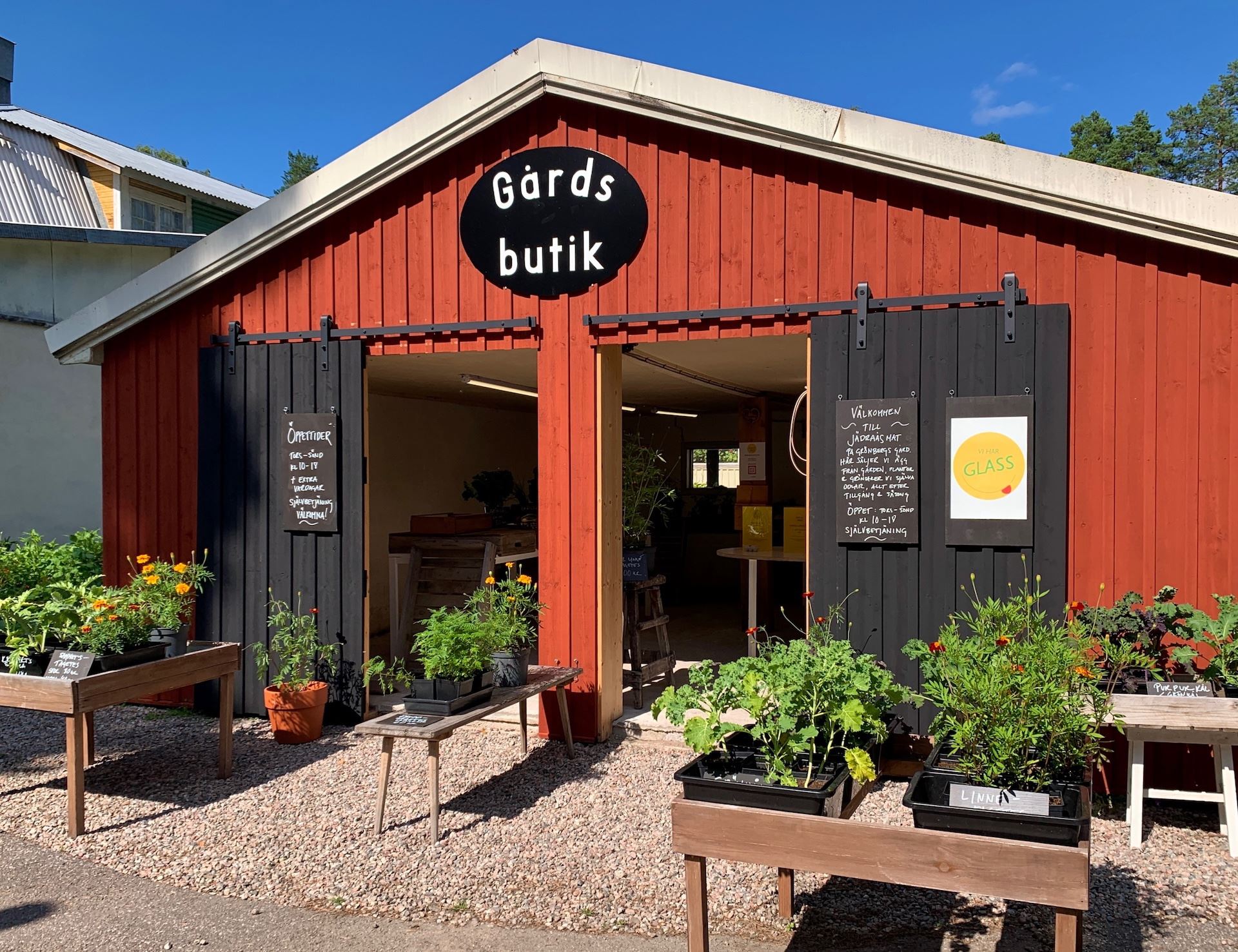 Öppettider tisdag-söndag kl. 10-18. Följ oss på Instagram @Jadraasmat #jadraasmat för evenemang och fikatillfällen i trädgården. Välkomna att handla lokalodlat och naturligt!