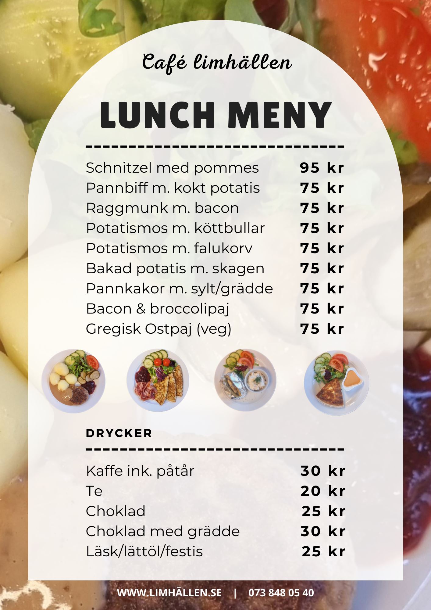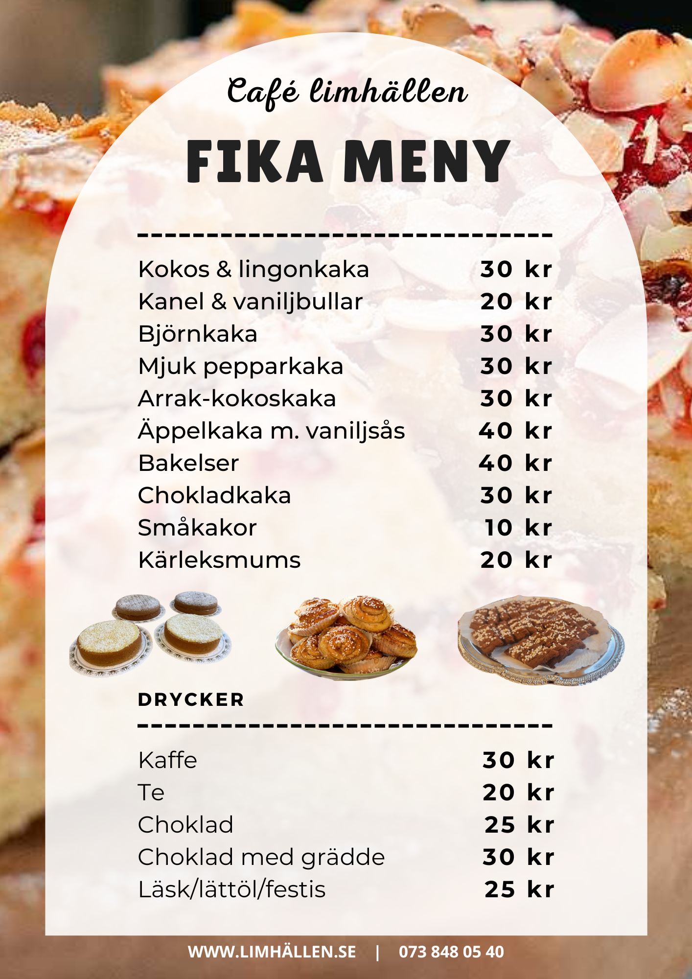 Café Limhällen är känt för sin charmiga atmosfär och erbjuder ett brett utbud av läckra bakverk, smörgåsar lunch och drycker. Det finns mjuka sittplatser och mysiga hörn där man kan slå sig ner och känna sig som hemma, en perfekt plats att koppla av och njuta av en trevlig stund. Caféets utomhusterrass är ett populärt val för många besökare, särskilt under varmare månader, då man kan avnjuta sin fika eller måltid utomhus i frisk luft. Utöver att vara en plats för avkoppling och njutning, anordnar Café Limhällen också olika evenemang och aktiviteter. Det kan vara allt från live-musik och utställningar till loppismarknad. Detta gör att caféet blir en levande och dynamisk mötesplats. Det går även att boka möten eller annan sammankomst med kaffe, smörgås, fikabröd etc. Varmt välkomna till oss!