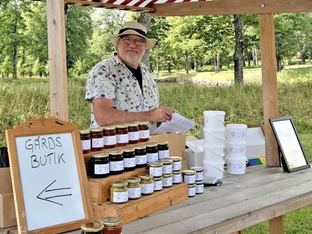 I vår gårdsbutik hittar du produkter av råvaror från skog och trädgård samt produkter från vår egen biodling mm. Bruksboden är över sommaren öppen dagligen i vår nya friggebod intill den romantiska Engelska parken. Butiken är obemannad och betalningen sker med SWISH. Biodling Några bikupor finns att se i kryddträdgården. I det gamla svinhuset på herrgårdsområdet har svinen fått ge plats för slugning av honung. Huset är från 1700-talet och kanske har Anna-Maria och hennes bror Reinhold Galle Ruckersköld. Våra bin finns även i Långshyttan och i Stjärnsundsområdet. De förser oss med såväl honung till försäljning som till sötningsmedel i våra egna handgjorda produkter. Bina är av rasen Cranier och är både snälla och duktiga på att samla nektar och pollen. Pollen säljas i våran butik och på marknader. Det är ett kosttillskott rikt på livsviktiga vitminer, mineraler, proteiner, enzymer och antibakteriella ämnen. Väldigt hälsobefrämjande och används bland annat av idrottare och vegetarianer. Kryddboden Det första du känner när du kliver in i den lilla boden är den helt underbara kryddoften som slår emot dig. Bara den gör att du kommer att känna dig lugn och lycklig. När du sedan har fått lukta, känna och smaka på alla de produkter vi har kommer lyckan att vara än större. En härlig känsla i din själ som du kommer att bära med dig länge. Hos oss hittar du ekologiska produkter från jordens alla hörn såväl som de produkter vi själva har producerat lokalt. Vår egen honung i olika smaker står på många matbord och du hittar snart din egen favorit. Vi har egengjorda kryddblandningar som passar till det mesta eller varför inte pröva vår egenkomponerade snapskrydda. Vi säljer också saft, sylt, chutney, marmelad och vinäger av hög kvalitet och som alla är producerade av Kryddan själv och av ekologiska produkter så långt det går. Sortimentet växlar med årstiderna och vi lanserar därför olika specialprodukter beroende på tid på året. Följ vår blogg så blir du snabbt uppdaterad om vad som är på gång i kastrullen och vilka produkter som kommer att finnas i butiken. Julen har en speciell plats för oss och inför juletid har vi utvalda julvaror. Du finner även våra egna teblandningar i Kryddboden och den utsökta och uppskattade chokladen från Stockholms Chokladfabrik. Lokalproducerad rybsolja från Husbys egna oljeshejker har vi naturligtvis också.