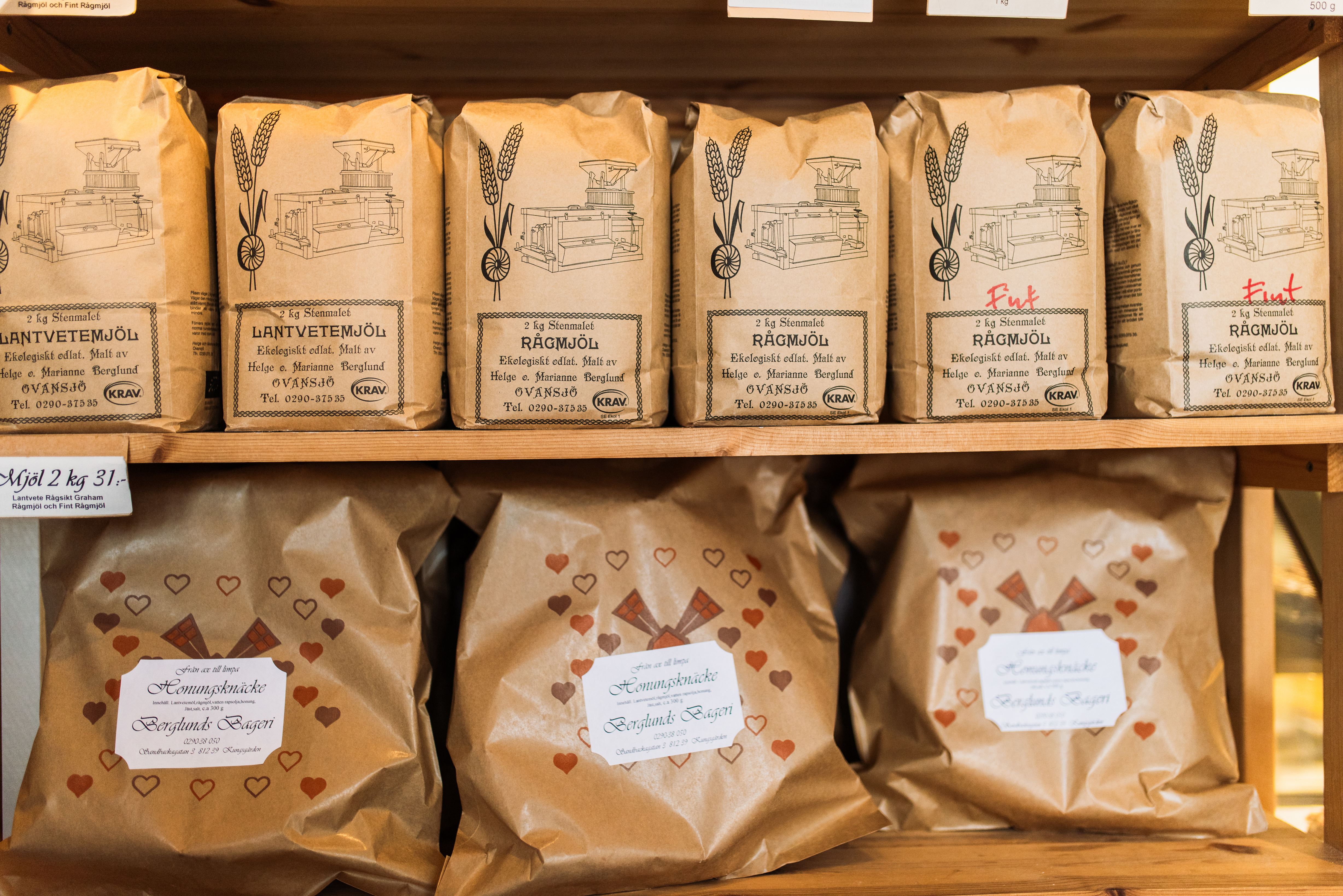 I bageriet bakar vi på ekologiskt odlat och nymalet mjöl från vår egen gårdskvarn. Så långt det är möjligt så använder vi oss av KRAV märkta råvaror.