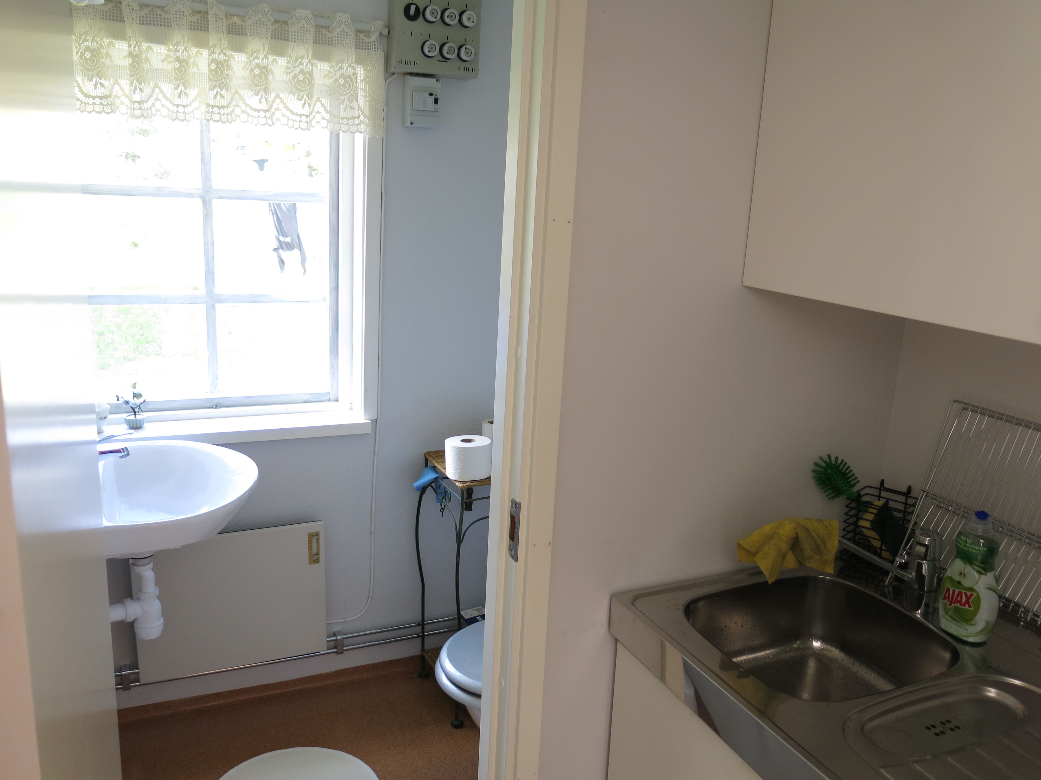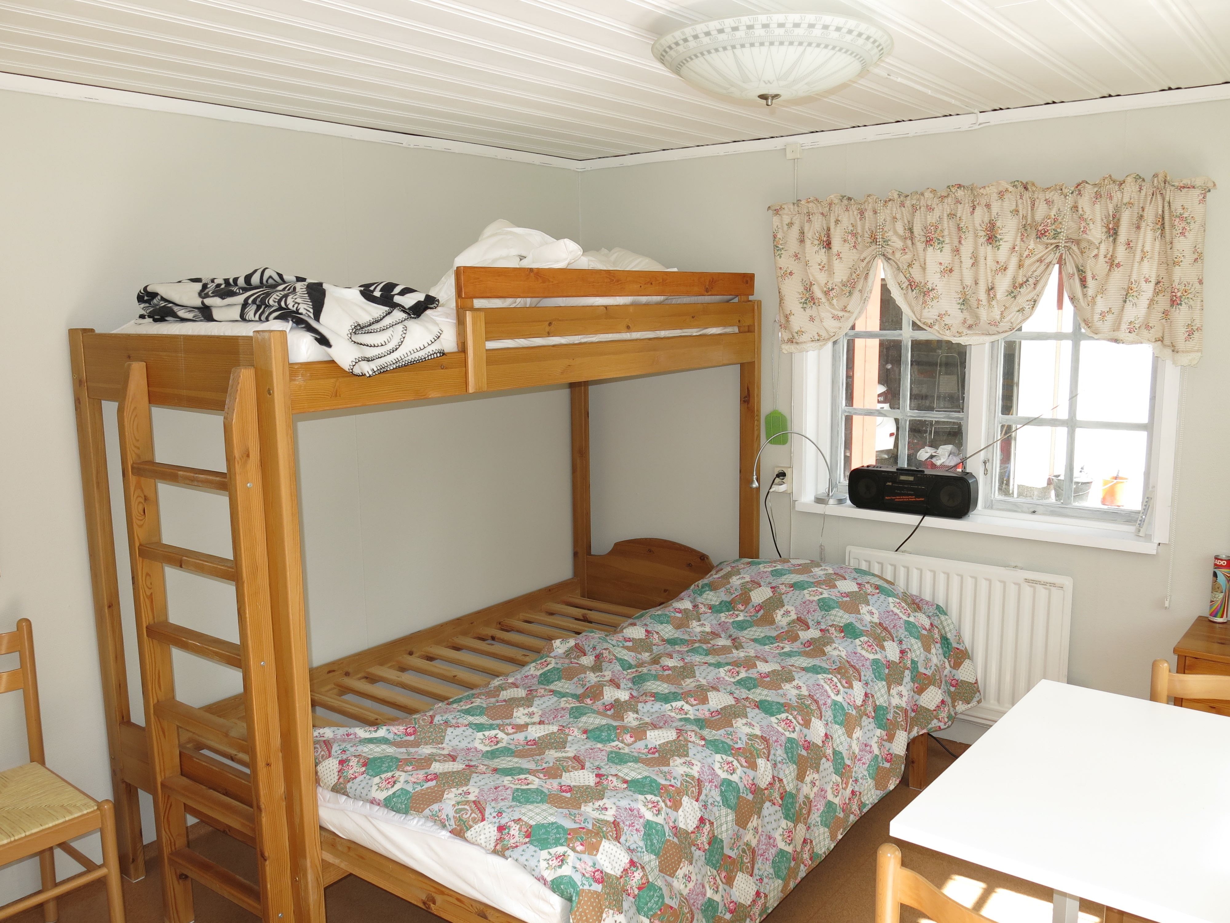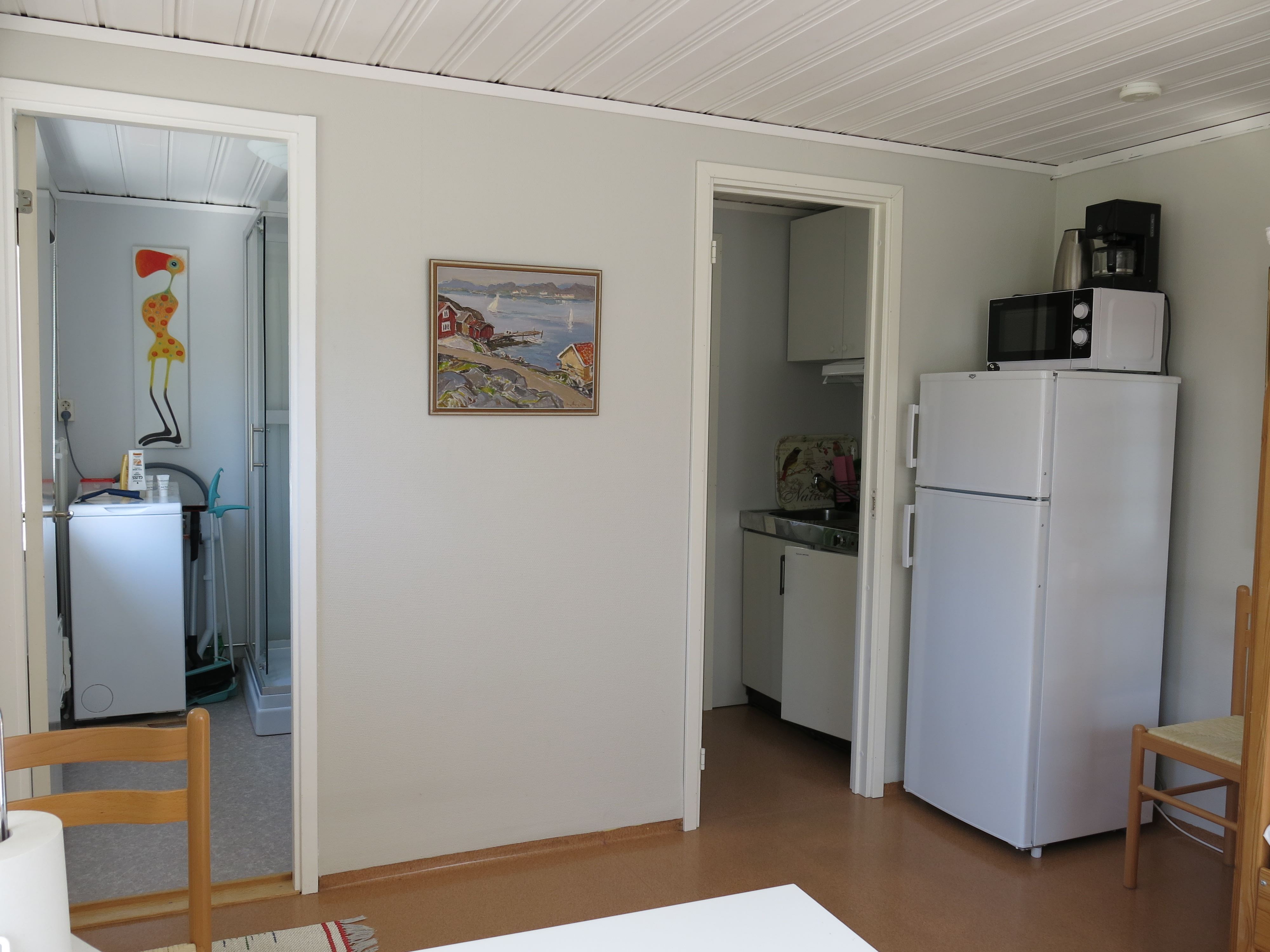 Stuga i närheten av havet. 20 kvm. 3 bäddar, (våningssäng, nederdelen är utdragbar) dusch, toa, tvättmaskin, litet kök (kokplattor).