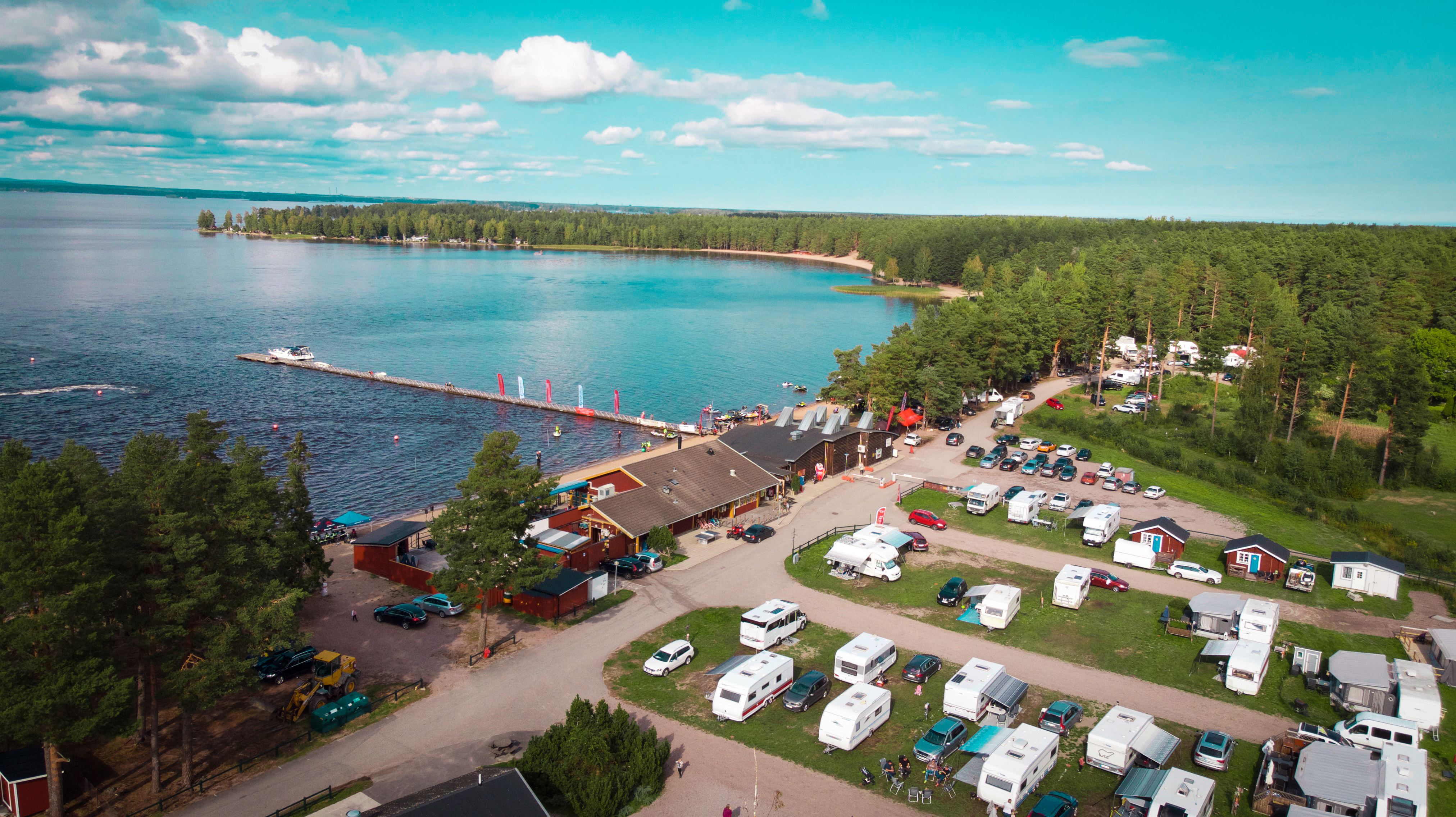Strandbaden kallas för Gästriklands riviera. En två kilometer lång sandstrand inbjuder till aktiviteter, sol och bad. Vintertid kan du åka långfärdsskridskor på den upplogade isbanan som sträcker sig mellan Strandbaden och Hedåsen. Centralt i campingen ligger två servicebyggnader med tillgång till toaletter, duschar, diskrum, kök och tvättstuga. Det finns lekplats, boule och minigolf. Vedeldad bastu, grillkåta samt badtunna finns att hyra. Strandbaden är en familjecamping varför åldersgränsen är 23 år. Husdjur är tillåtna om de är kopplade och rastas utanför området.