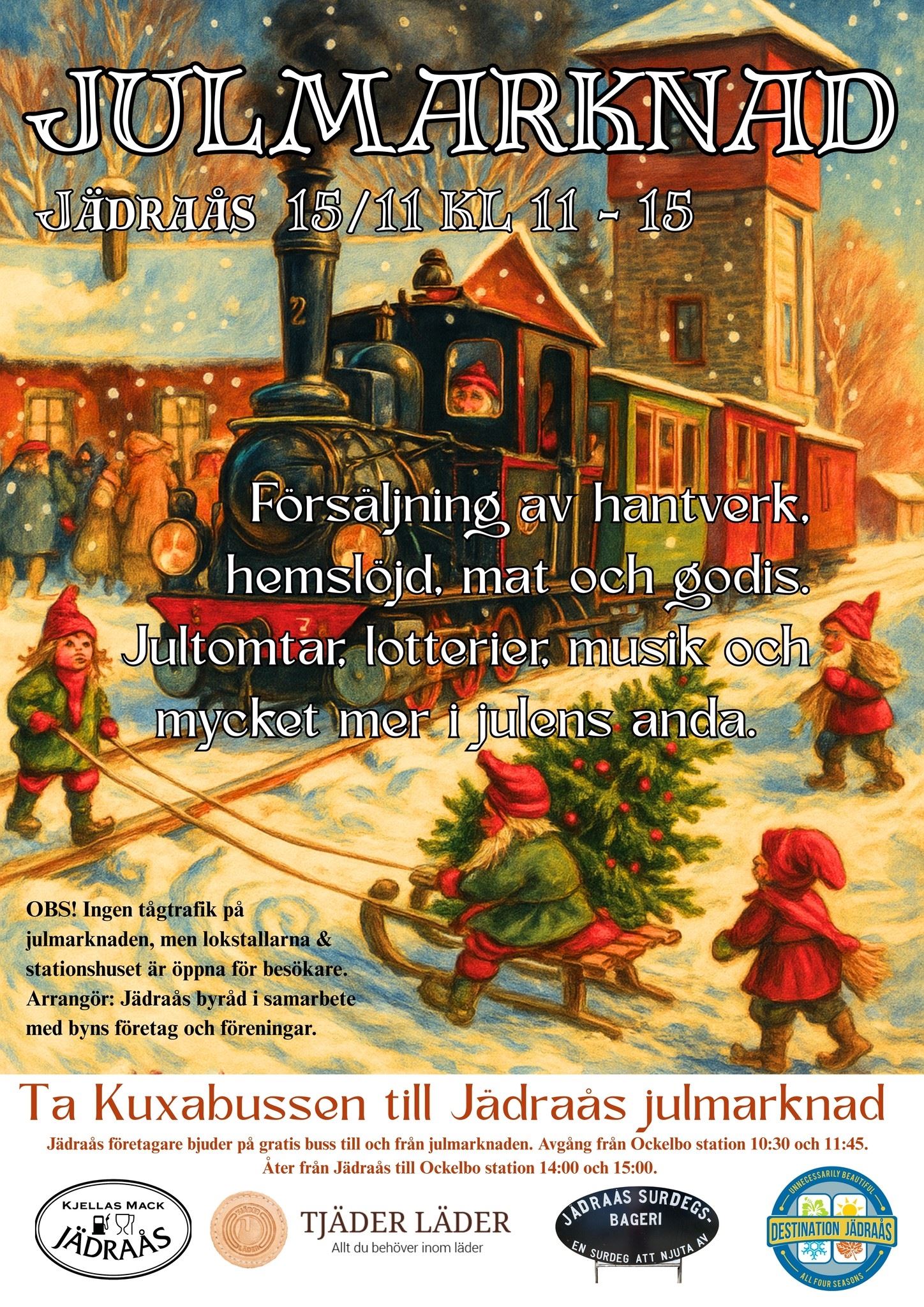 Försäljning av hantverk, hemslöjd, mat och godis. Jultomtar, lotterier, musik och mycket mer i julens anda. Under julmarknaden går ingen tågtrafik, men lokstallarna och stationshuset är öppna för besökare. Ta Kuxabussen till Jädraås julmarknad! Jädraås företagare bjuder på gratis buss till och från julmarknaden. Avgång från Ockelbo station kl. 10.30 och 11.45 - Åter från Jädraås till Ockelbo station 14.00 och 15.00. Välkomna!