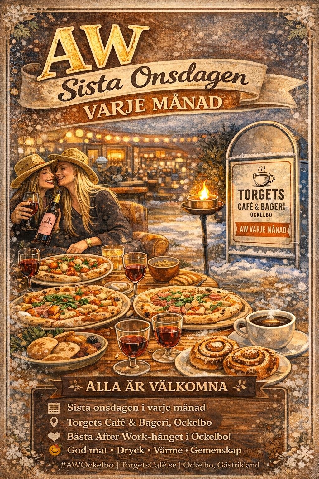 En plats där arbetsdagen får rinna av, samtalen tar vid och kvällen får landa i sin egen takt. Kom förbi direkt efter jobbet eller senare under kvällen. Ta ett glas, dela något gott att äta, slå dig ner en stund – eller stanna länge. Här finns inga måsten, bara skön stämning och människor som vill ha det trevligt tillsammans. Det här är vår AW. En återkommande kväll att räkna med, längta till och göra till din egen tradition. * AW – sista onsdagen varje månad * Torgets Café & Bageri, Ockelbo Alla är varmt välkomna!