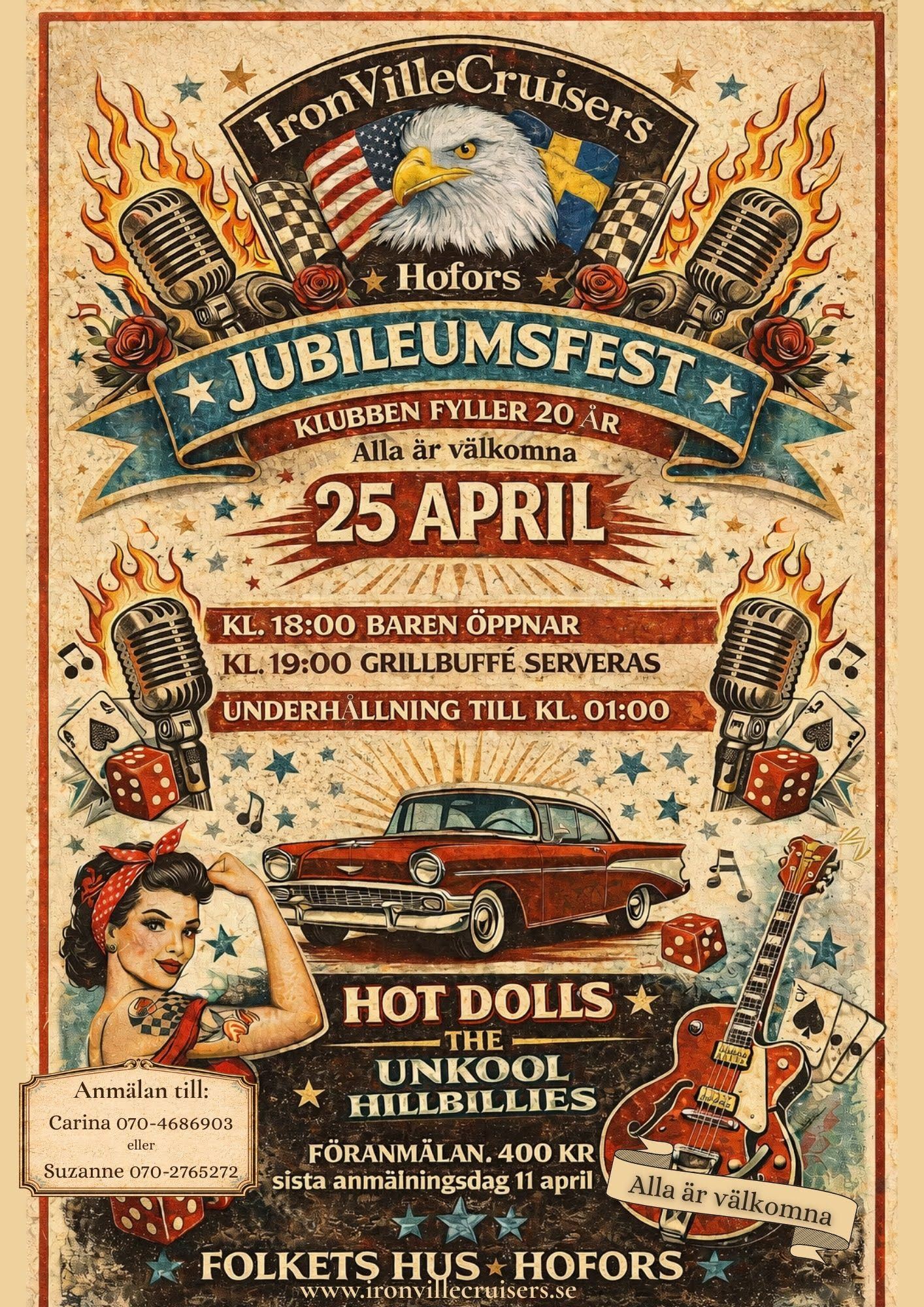 kl. 18 öppnas baren kl. 19 Grillbuffe serveras Underhållning till kl. 01.00 HOT DOLLS & THE UNKOOL HILLSBILLIES FÖRANMÄLAN: 400kr sista anmälansdag: 11 April