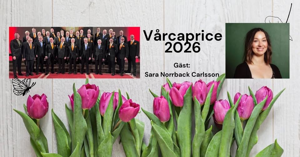 För andra året blir det en härlig vårcaprice med våra Sjungande män! Körerna gästas i år av Sandvikenbördiga mezzosopranen SARA NORRBACK CARLSSON och de bjuder tillsammans på en våryr konsert med massor av härlig och välkänd musik! Det blir musik av bl.a. Elvis Presley, ABBA, Evert Taube och mycket mer. Medverkande: Sjungande män Sandviken Sjungande män Ockelbo SARA NORRBACK CARLSSON, gästartist Christopher Andersson Bång, kontrabas Mathias Dahl, slagverk Emelie Linde, piano och kapellmästare Tony Margeta, dirigent Vårcapricen ges i Ockelbo kyrka lördag 11/4 kl. 16.00 och Sandvikens kyrka söndag 12/4 kl. 16.00. Konsertlängd ca 60 min.