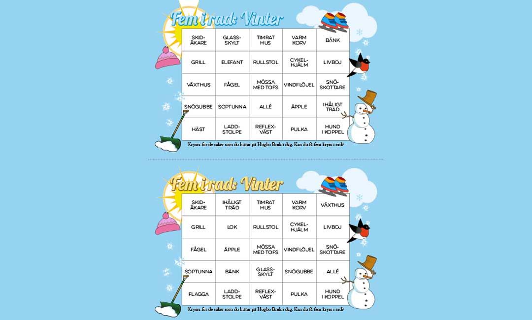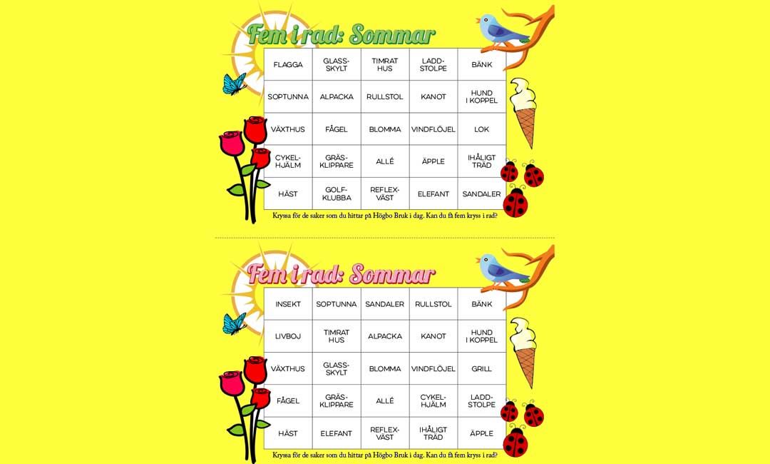 Fem i rad-spelet är ett kul sätt att upptäcka saker som du inte har lagt märke till förut. Du ska kryssa för så många ord på spelplanen som möjligt. För att få kryssa ett ord måste du ha sett föremålet på bruket. Det gäller alltså dels att vara skarpögd, dels att lista ut var olika saker kan finnas. Det underlättar så klart om du är bekant med Högbo Bruk men du kan också använda dig av hemsidan eller kartan i Högboguiden se länk nedan. Skriv ut brickorna på egen skrivare via länk nedan