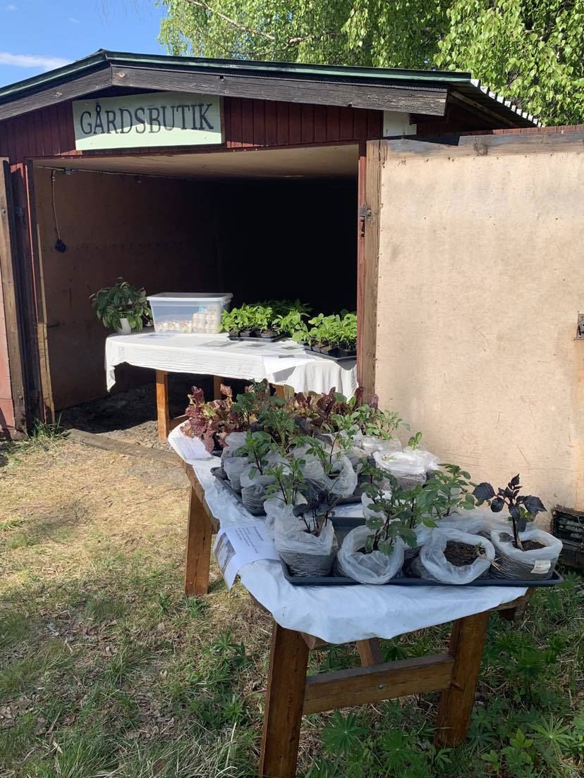 Gårdsbutik med försäljning av bland annat ägg, grönsaksplantor och kryddor.