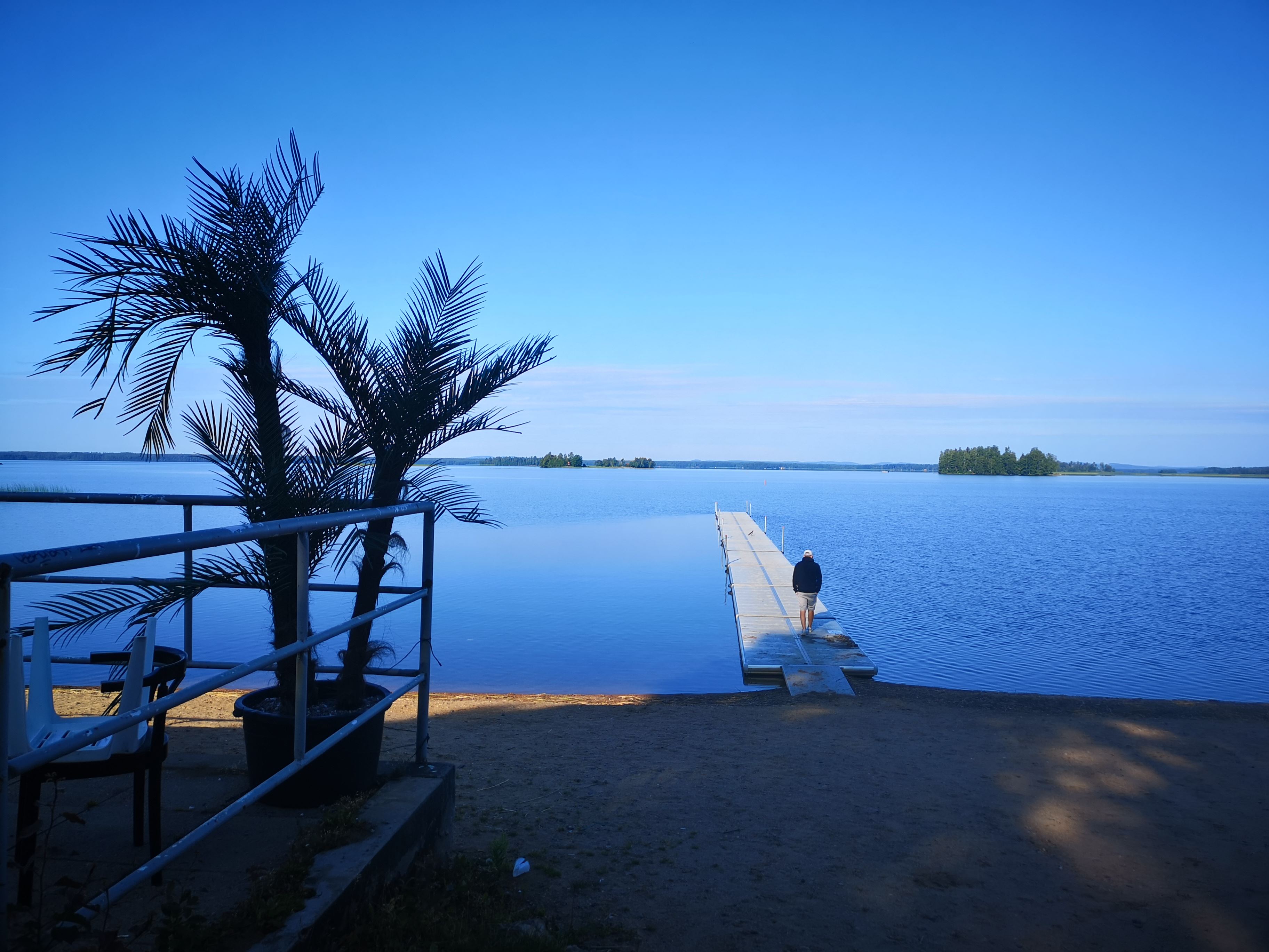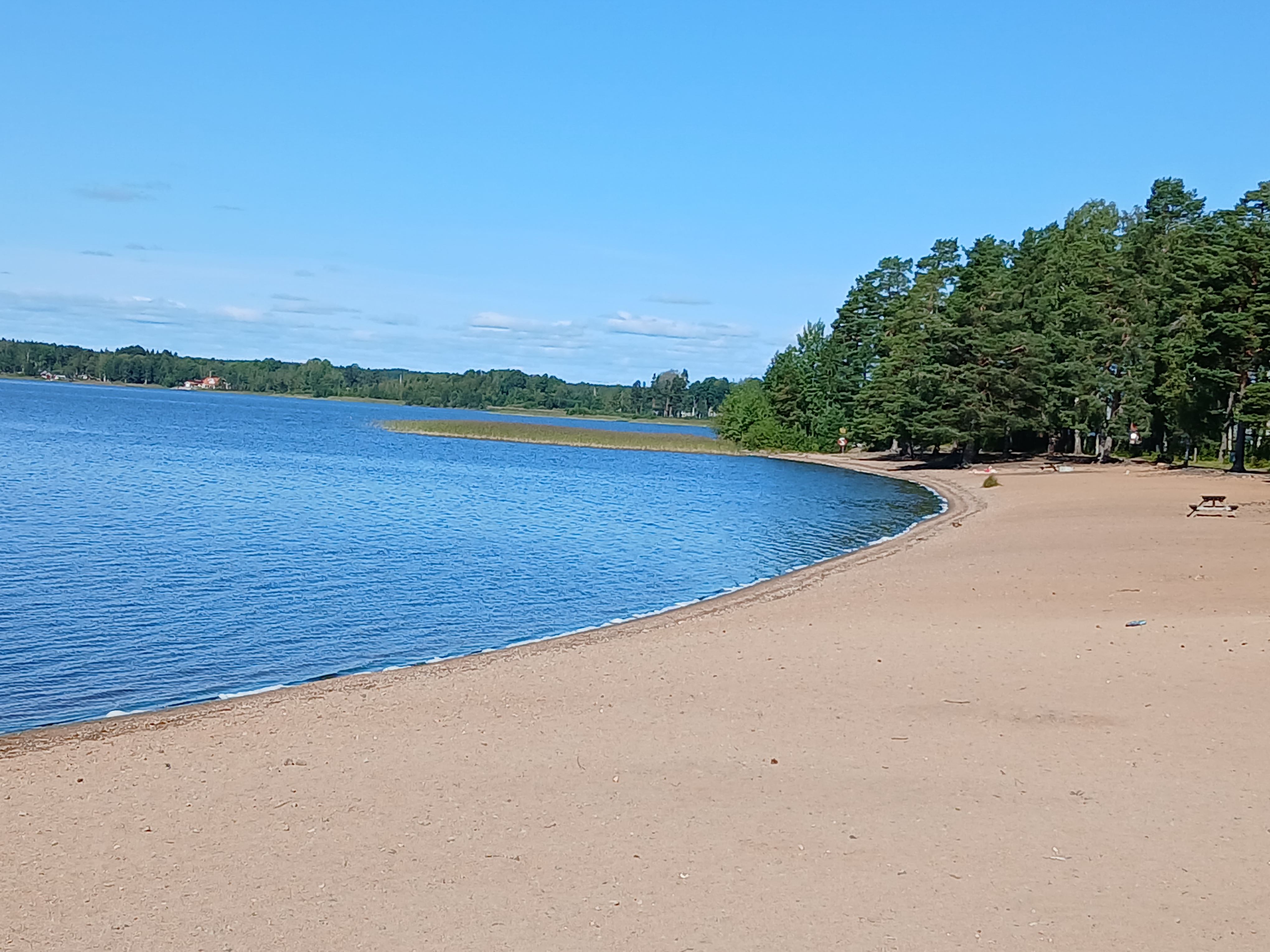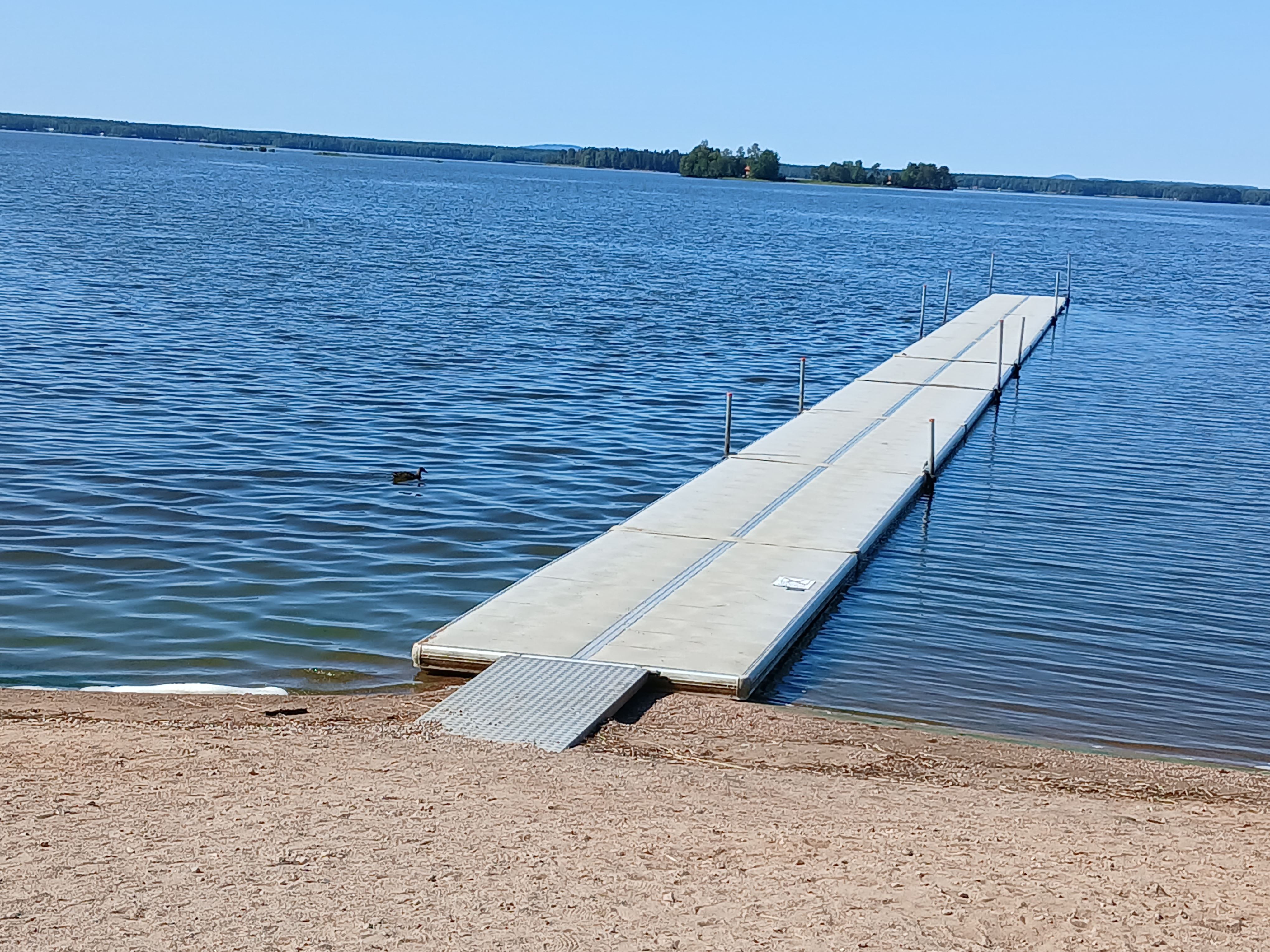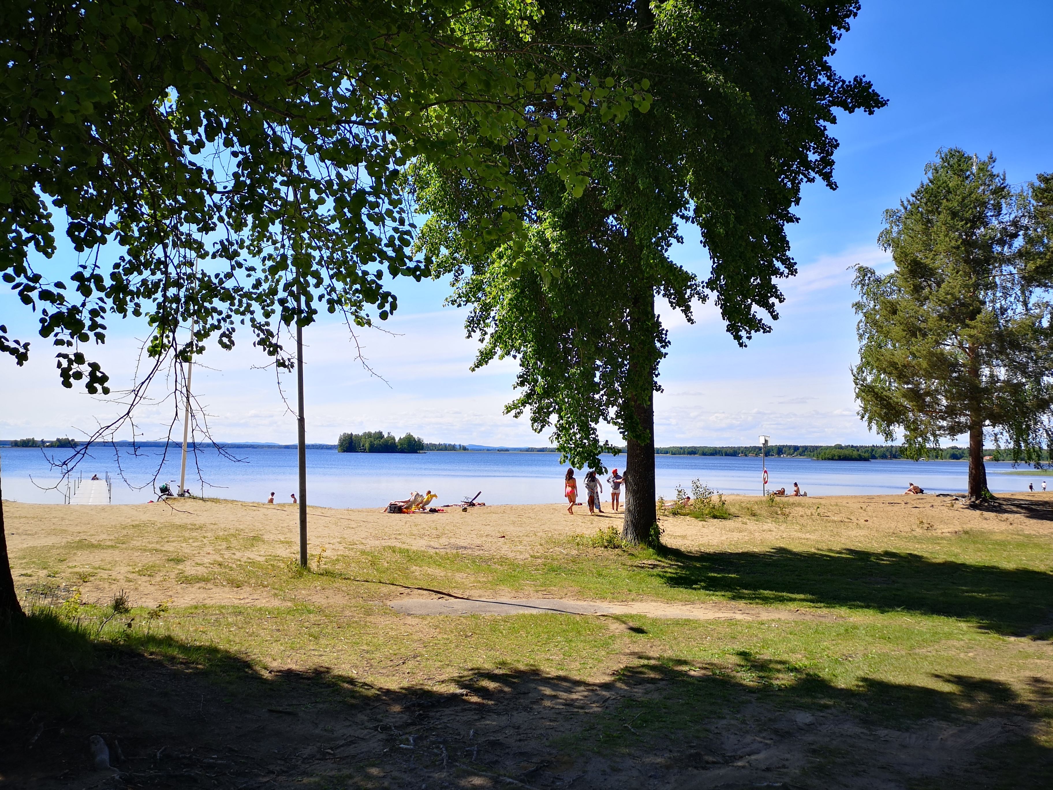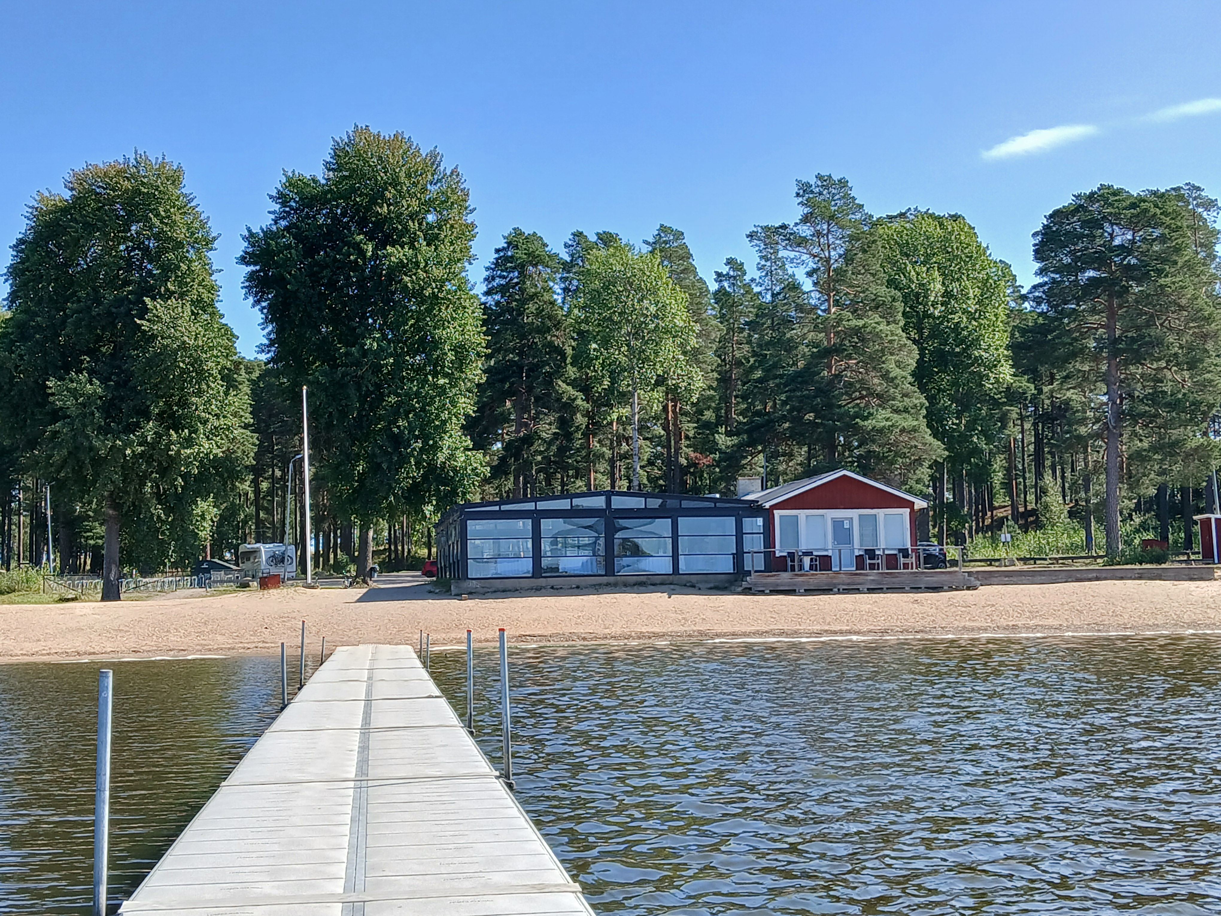 Barnvänligt bad i Storsjön med sandstrand, badbrygga, beach-volleybana, servering, båtplatser och husvagnsplatser.