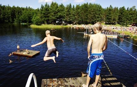 Föreningsskött insjöbad med trampoliner på en och tre meter, hopptorn upp till 10 meter, beachvolleybollplan och stora gräsytor för solning och lek. Kiosk med godis, läsk, glass, kaffe och smörgås. Grillplats.